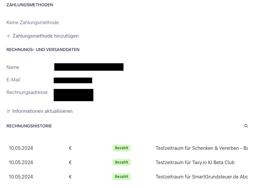Auf der neuen Seite sehen Sie alle Einzelheiten zu ihren Abonnements und die Historie Ihrer Rechnungen. Zusätzlich können Sie andere Zahlungsmethoden hinzufügen.